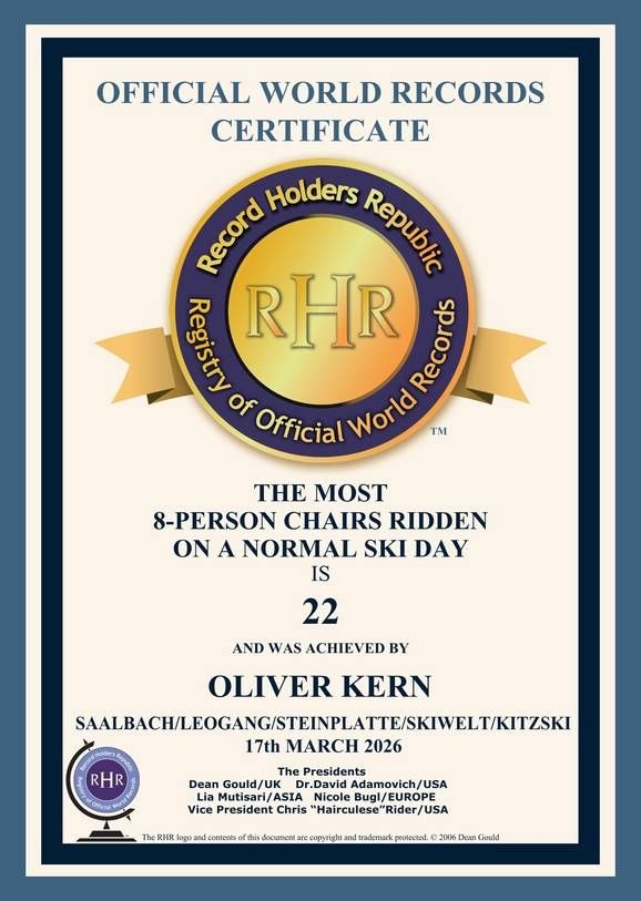 Um 15:46 Uhr erreichte Oliver Kern die 22. 8er-Sesselbahn, wodurch der Weltrekord offiziell fixiert wurde.